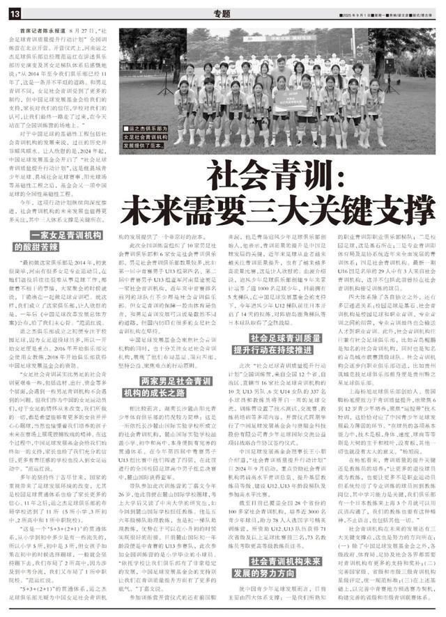 对于中国足球的基础性工程包括社会青训机构的发展来说,过往的历史并非顺风顺水。让人欣慰的是,2024年起,中国足球发展基金会开启了“社会足球青训质量提升行动计划”,这是继县域青少年足球、县域社会足球赛事、阳光球场等基础性工程之后,基金会又一项中国